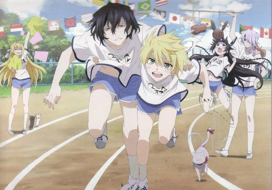 Animerte Karakterer I En Sportssetting, Som Løper På En Bane Med En Festlig Bakgrunn, Som Viser En Blanding Av Besluttsomhet Og Glede.