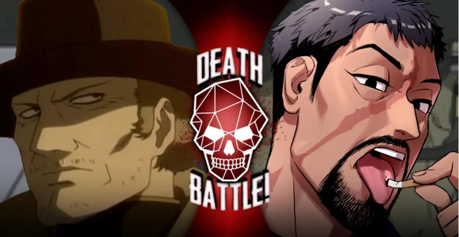 To Animerte Mannlige Karakterer Står Ansikt Til Ansikt Med Et "dødsstrid"-logo I Midten; Den Ene Har På Seg En Hatt Og Den Andre Har Skjegg Og Holder En Tannpirker.