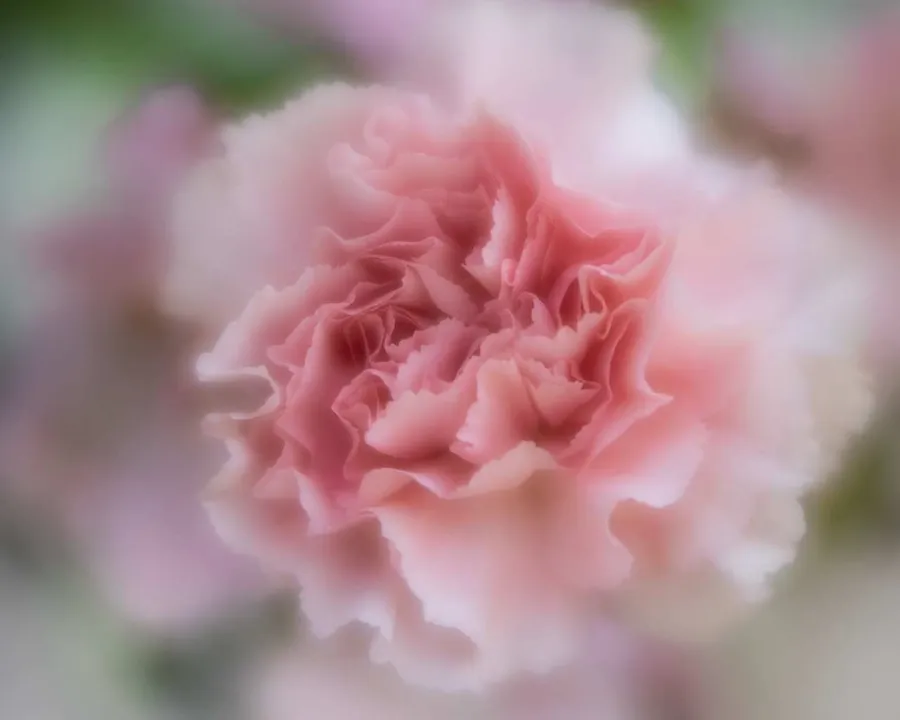 Nærbilde Av En Blek Rosa Nellike Med Rufsete Kronblader, Uskarp Bakgrunn Som Fremhever Den Delikate Teksturen Og Fargen.