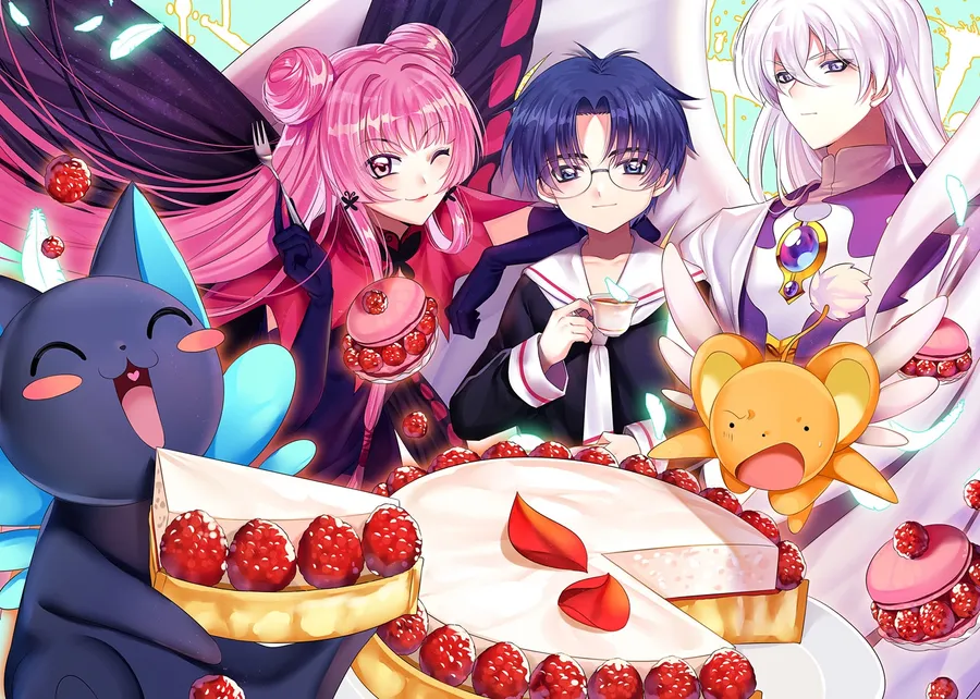 Animerte Karakterer Fra Cardcaptor Sakura Med En Jordbærkake, Inkludert Ruby Moon, Keroberos, Og Spinel Sun.