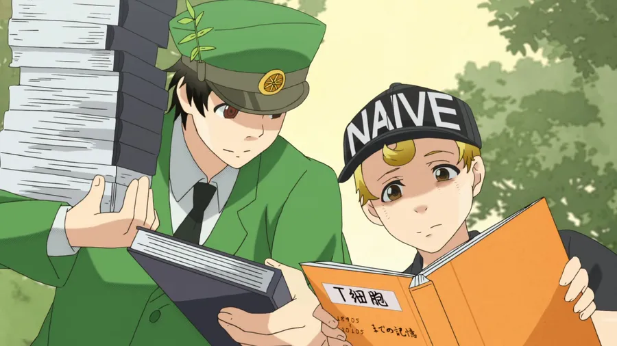 To Animerte Karakterer Fra 'cellene På Jobb!', En Dendrittisk Celle I Grønn Uniform Som Bærer Bøker Og En Naiv T Celle I Caps Som Leser En Oransje Bok.
