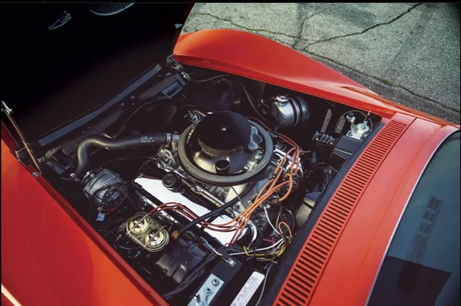 Et Nærbilde Av En Chevrolet Corvettes Åpne Motorrom, Som Viser Motorens Komponenter Og Montering.