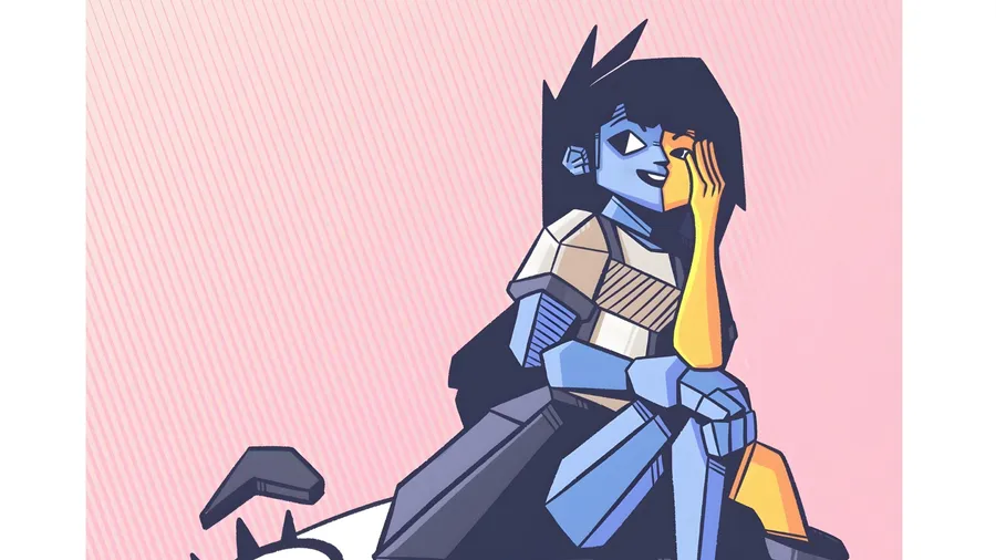 Stilisert Digital Kunst Av Ena Som Viser En Tankefull Posisjon Med Livlige Blå Og Gule Toner Mot En Myk Rosa Bakgrunn.