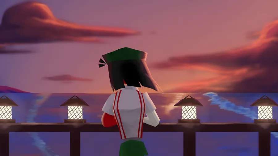 Ena-karakteren Nyter En Fredelig Solnedgang Fra En Balkong Med Lysende Lanterner Og En Fargerik Himmel I Et Virtuelt Miljø.