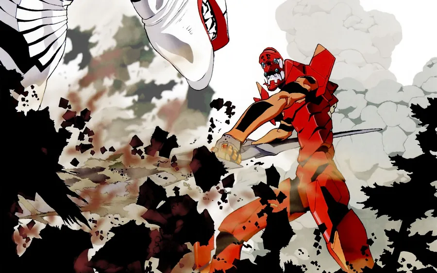 Et Slående, Høyoppløselig Bilde Av Eva-02, Den Ikoniske Mechaen Fra Anime Neon Genesis Evangelion, Klar For Kamp Med Den Futuristiske Bylandskapet Som Bakgrunn.