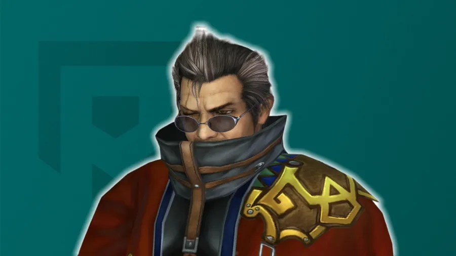 Digital Kunstverk Av Auron Fra Final Fantasy, Med Hans Ikoniske Røde Frakk, Solbriller Og Arr, Satt Mot En Teal Bakgrunn.