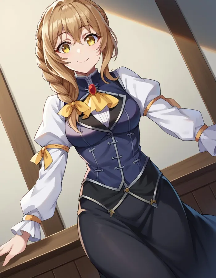 En Smilende Anime-karakter Med Blondt Hår, Gule Øyne, Iført En Blå Kjole Med En Gul Sløyfe Og En Rød Smykkekjede, Lene Seg Mot En Treoverflate.