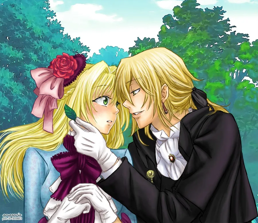Et Blondt Anime-par I En Nær Omfavnelse, Med Den Mannlige Karakteren Som Lener Seg Mot Den Kvinnelige Karakteren Som Ser Overrasket Ut, Satt Mot En Frodig Grønn Skogbakgrunn.