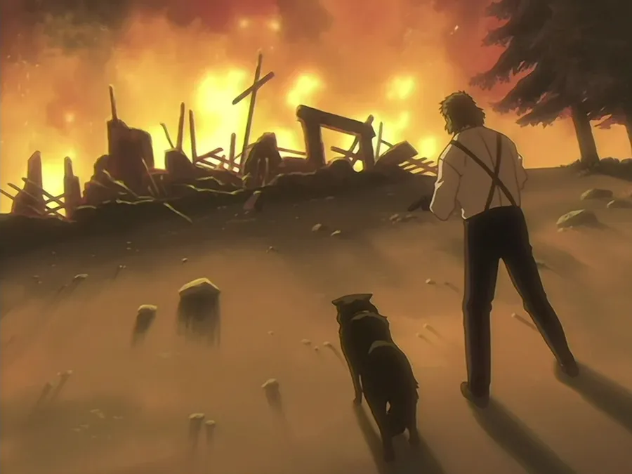 En Mann Og En Hund Står Foran En Brennende Bakgrunn Med Ødelagte Strukturer Og Kors, Som Antyder En Scene Av Ødeleggelse Eller Krigseffekter.