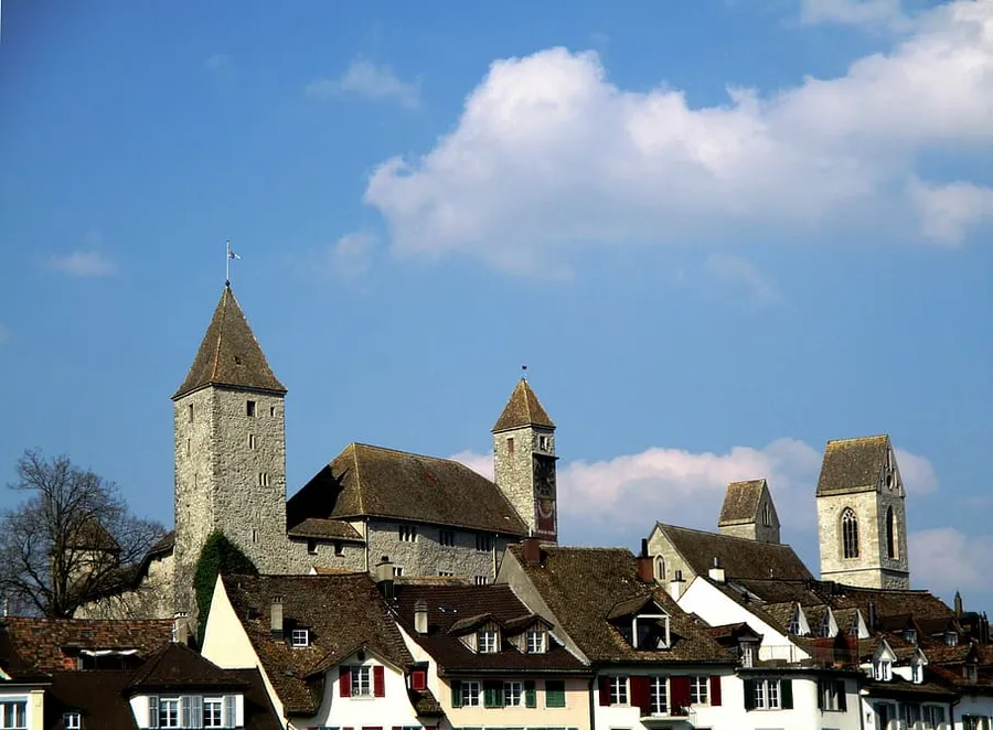 En Utsikt Over Rapperswils Historiske Arkitektur Med Steintårn Og Tak Med Fliser Mot En Klar Blå Himmel.
