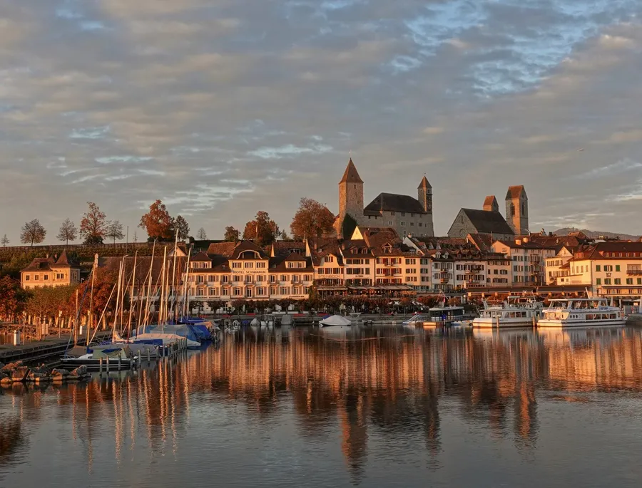 Gylden Solnedgang Over Zürich-sjøen Med Rapperswil Slott Og Marina, Som Reflekterer På Det Rolige Vannet Med Båter Og Historisk Arkitektur.