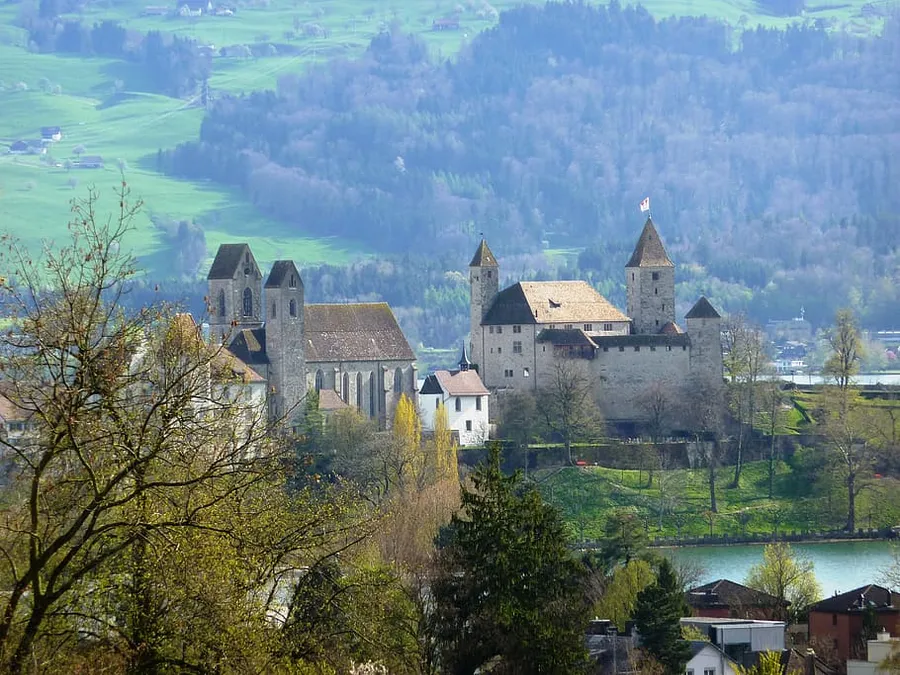 En Utsikt Over Rapperswil Slott Og Tilstøtende Bygninger Med Zürichsjøen I Bakgrunnen, Omgitt Av Frodig Grønt.