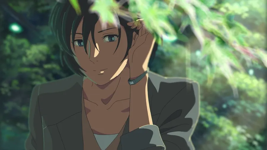 Animasjonskarakter Yukari Yukino Med Et Subtilt Smil, Berører Håret Sitt, Mot En Uskarp Bakgrunn Av Grønn Løvverk.