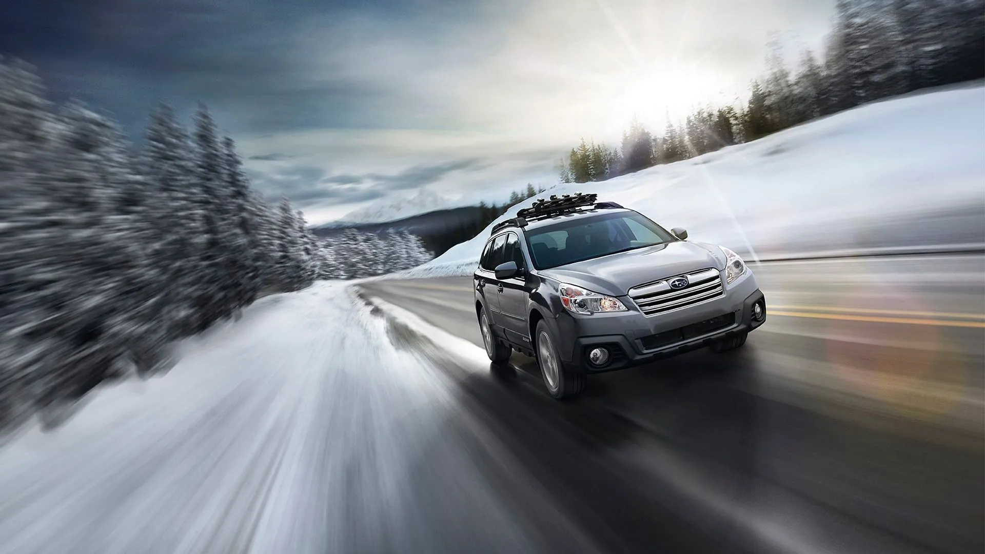 Sporty Subaru Outback På Snødekt Vei Bakgrunnsbilder