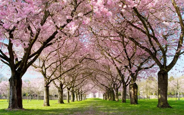Fredelig Vårpark Med Blomstrende Trær Og Grønt Gress Bakgrunnsbilder -